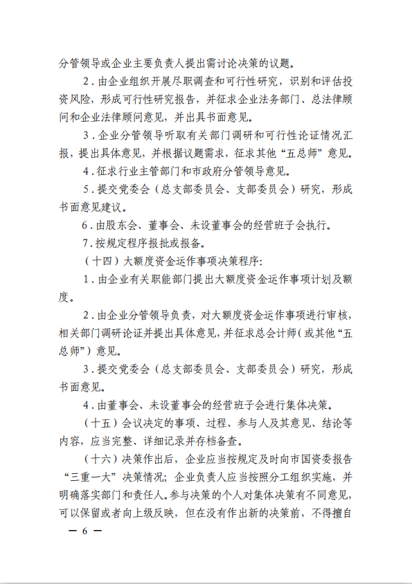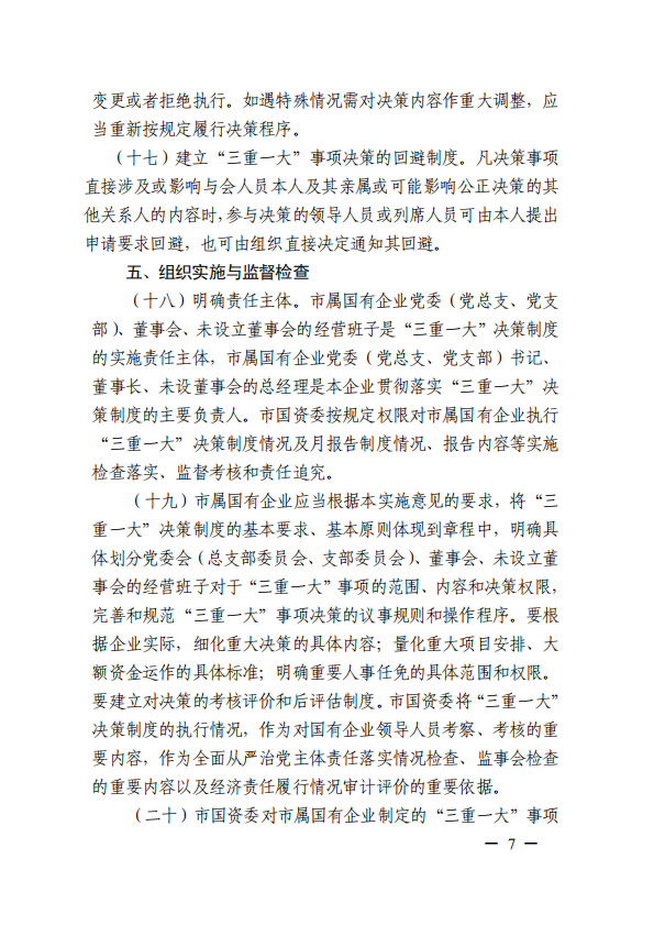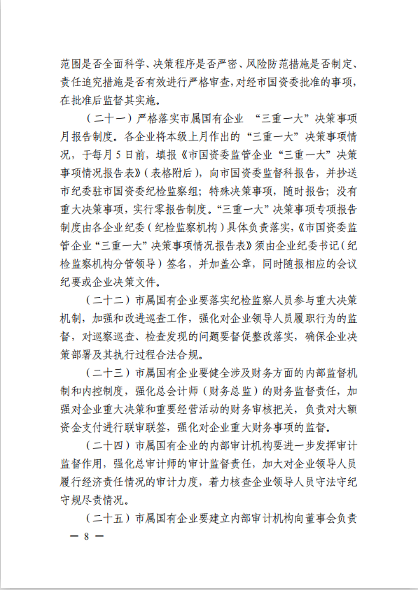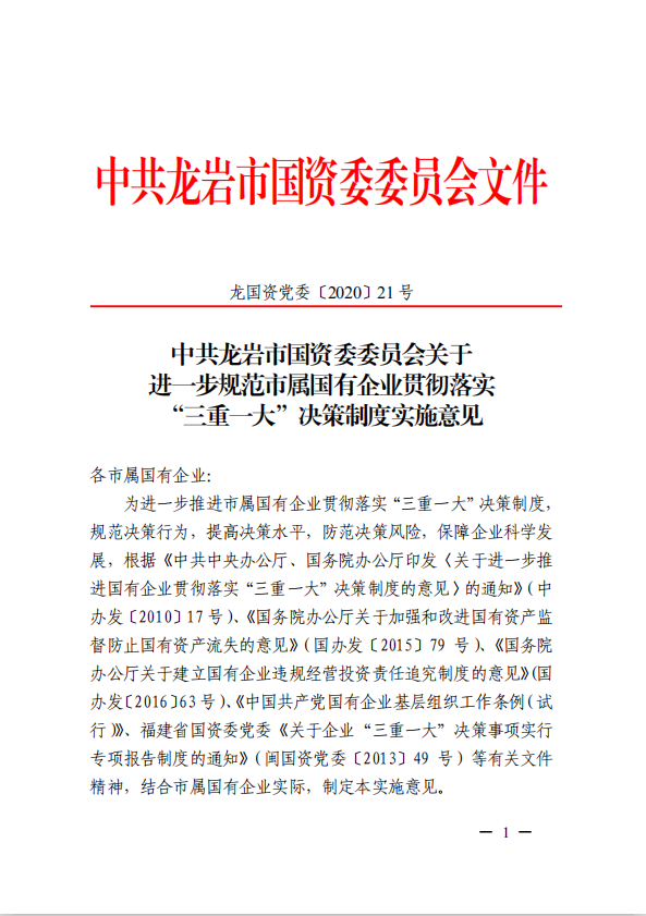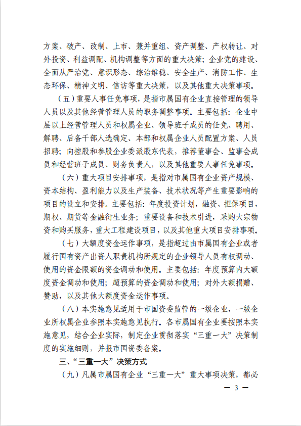關(guān)于進一步規(guī)范市屬國有企業(yè)貫徹落實“三重一大”決策制度實施意見(國資黨委[2020]21號)